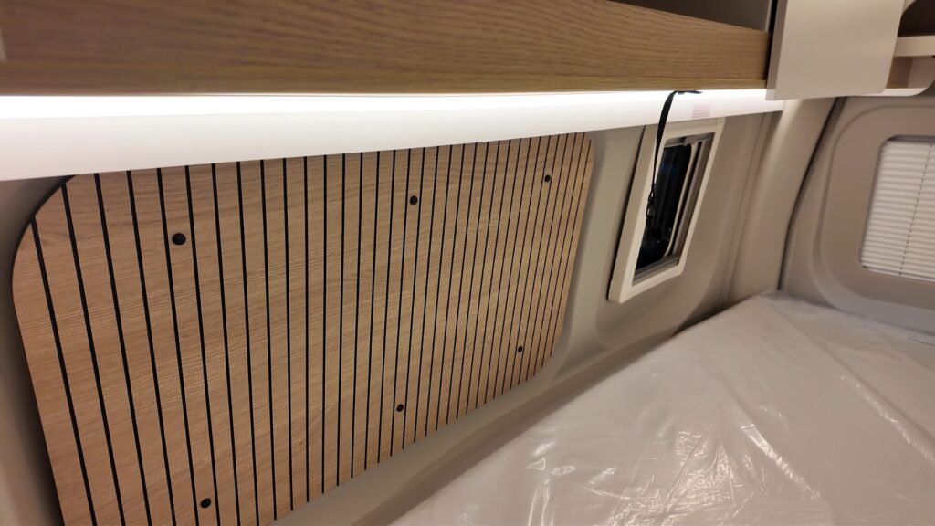 Zadní část vestavby je koncipována jako pohodlná ložnice s podélnými lůžky. Stěny zdobí krásné obkladové panely, které prostoru propůjčují luxusnější vzhled. O dostatek odkládacích ploch pro knihy, časopisy či telefony se starají praktické kapsy a prostorná polička v zadní části. Okna v zadních dveřích jsou tvořena původním neotevíratelným prosklením a pro zajištění soukromí jsou vybavena stahovacími roletkami.