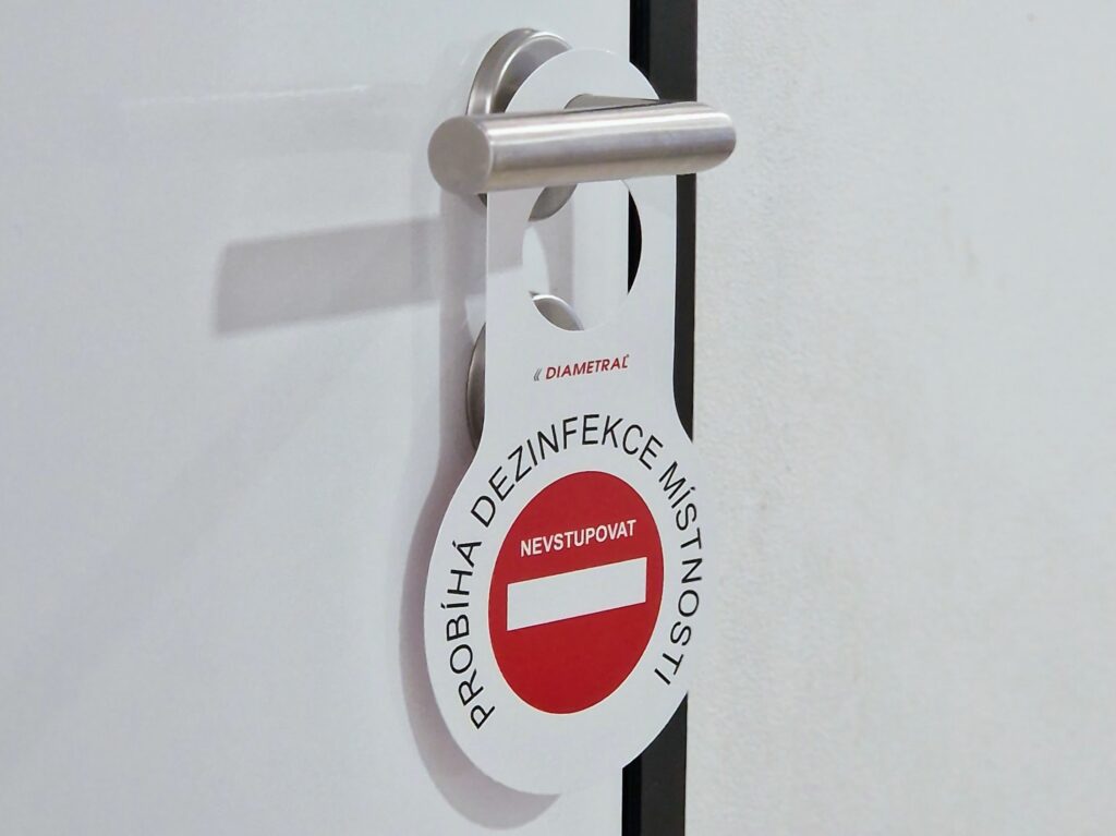 Proč takového čekání? Protože ozón je jedovatý a zdraví škodlivý plyn, který je ale naštěstí nestabilní a rychle se rozpadá na molekuly kyslíku O2. Takže zhruba po třech hodinách je hotovo. Mimochodem, v balení je velice praktická visačka na kliku dveří, která nás zapomnětlivější upozorní, že probíhá dezinfekce prostoru. Hezký detail…